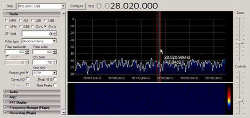 Aunque tal vez no se aprecie con claridad en las imágenes, tenemos una señal clara tanto en 12 como 10 metros, mas intensa en esta última banda. En el waterfall podrían ajustarse los valores de contraste para hacer mas "visible" la señal, pero para mantener la uniformidad en el test se ha dejado el mismo valor que para todas las demas medidas.